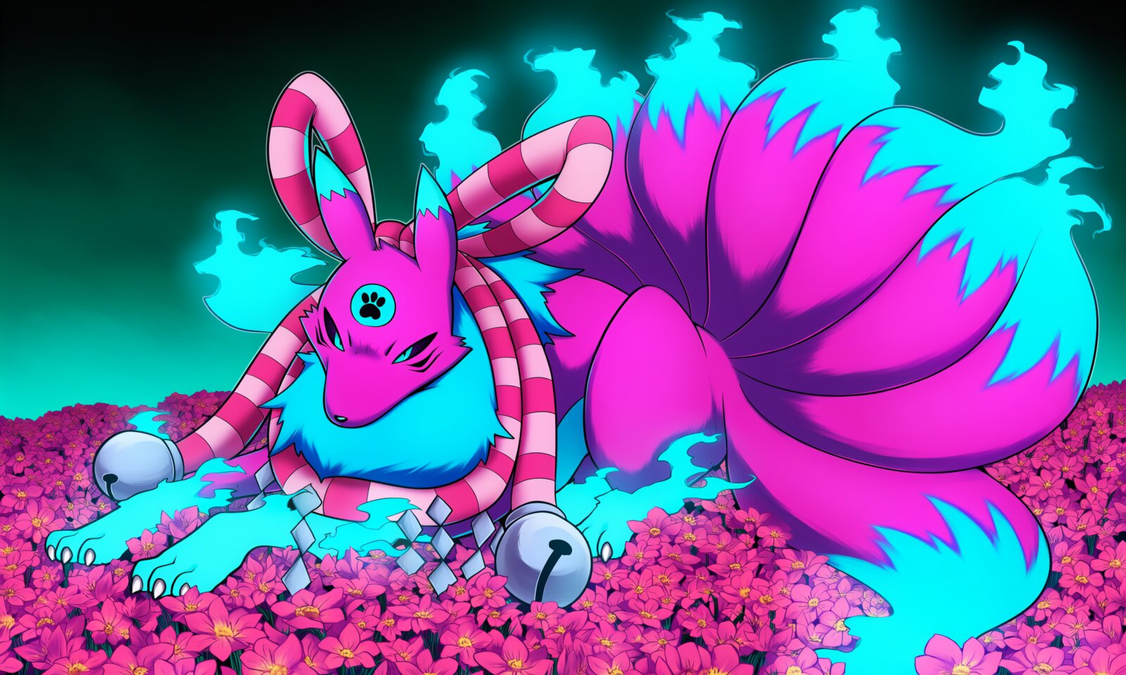 Xenon is a Kyubimon OC with purple, blue and aqua fur and a paw insignia on her forehead.